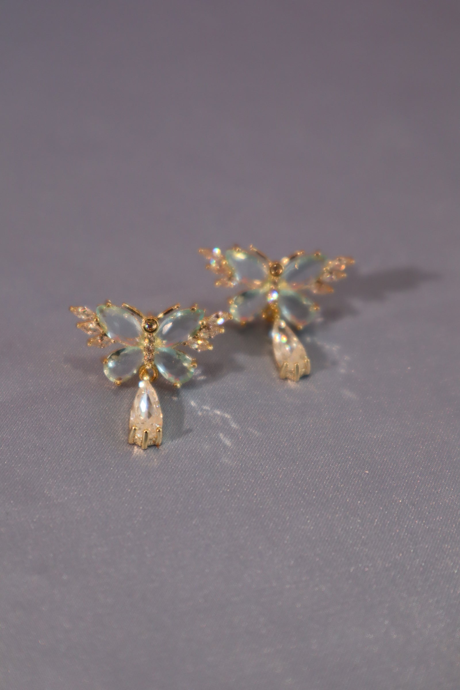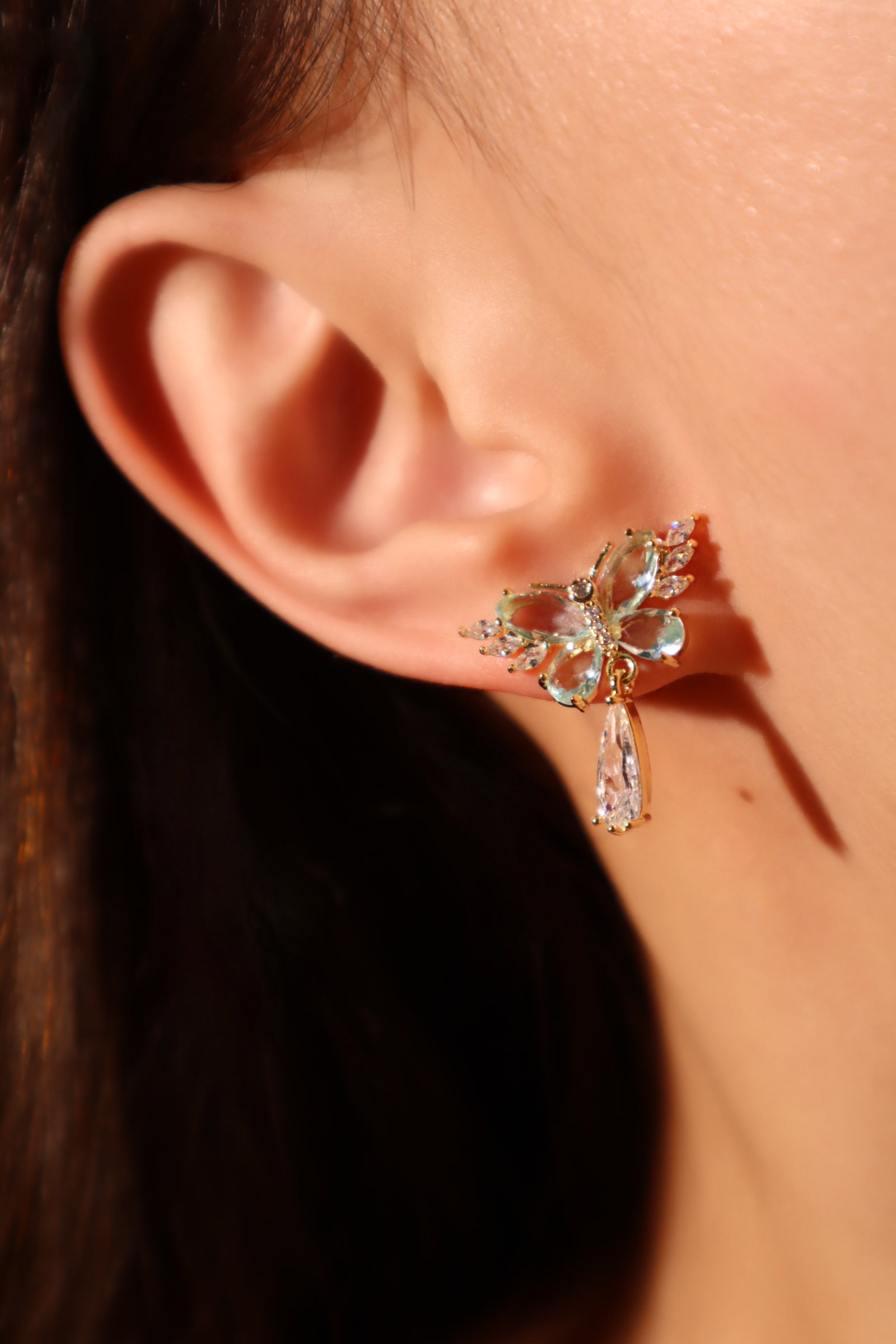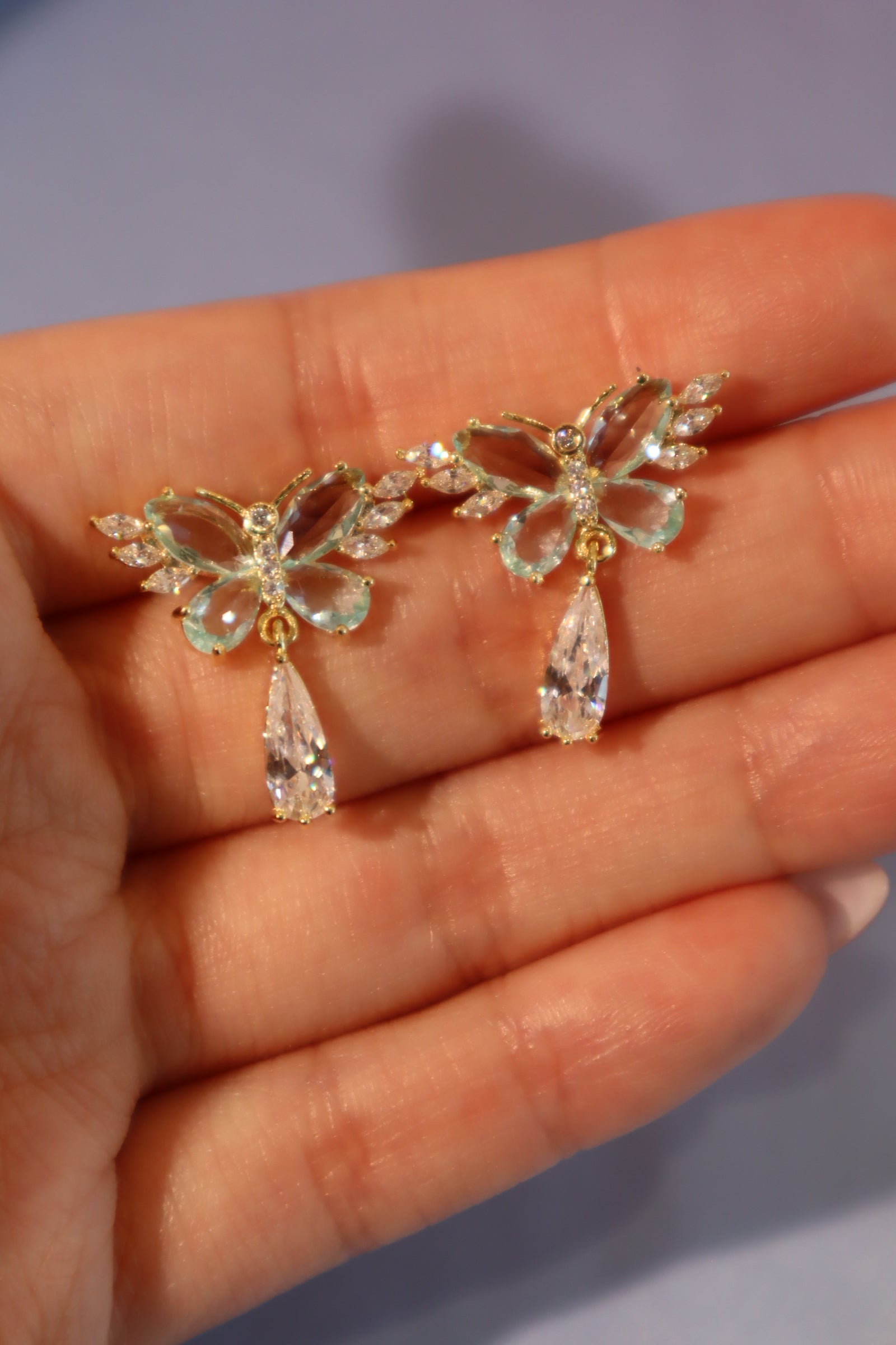 Our 14K Real Gold Plated Blue Gem Butterfly Diamond Earrings are ethereal. This pair of earrings is adorned with high quality zirconia green gemstones that sparkle and shine angelically. When you can’t decide on a look, match these earrings with your outfit to be your saving grace!