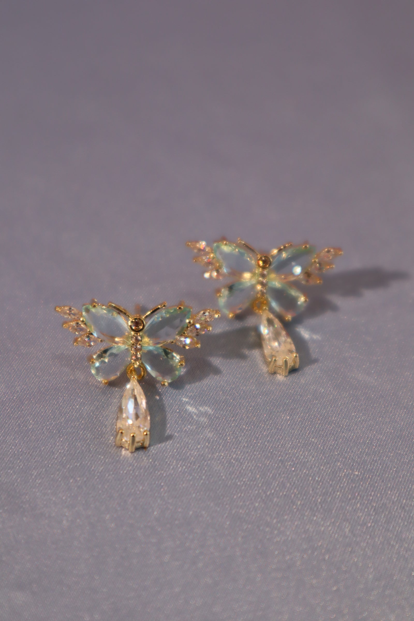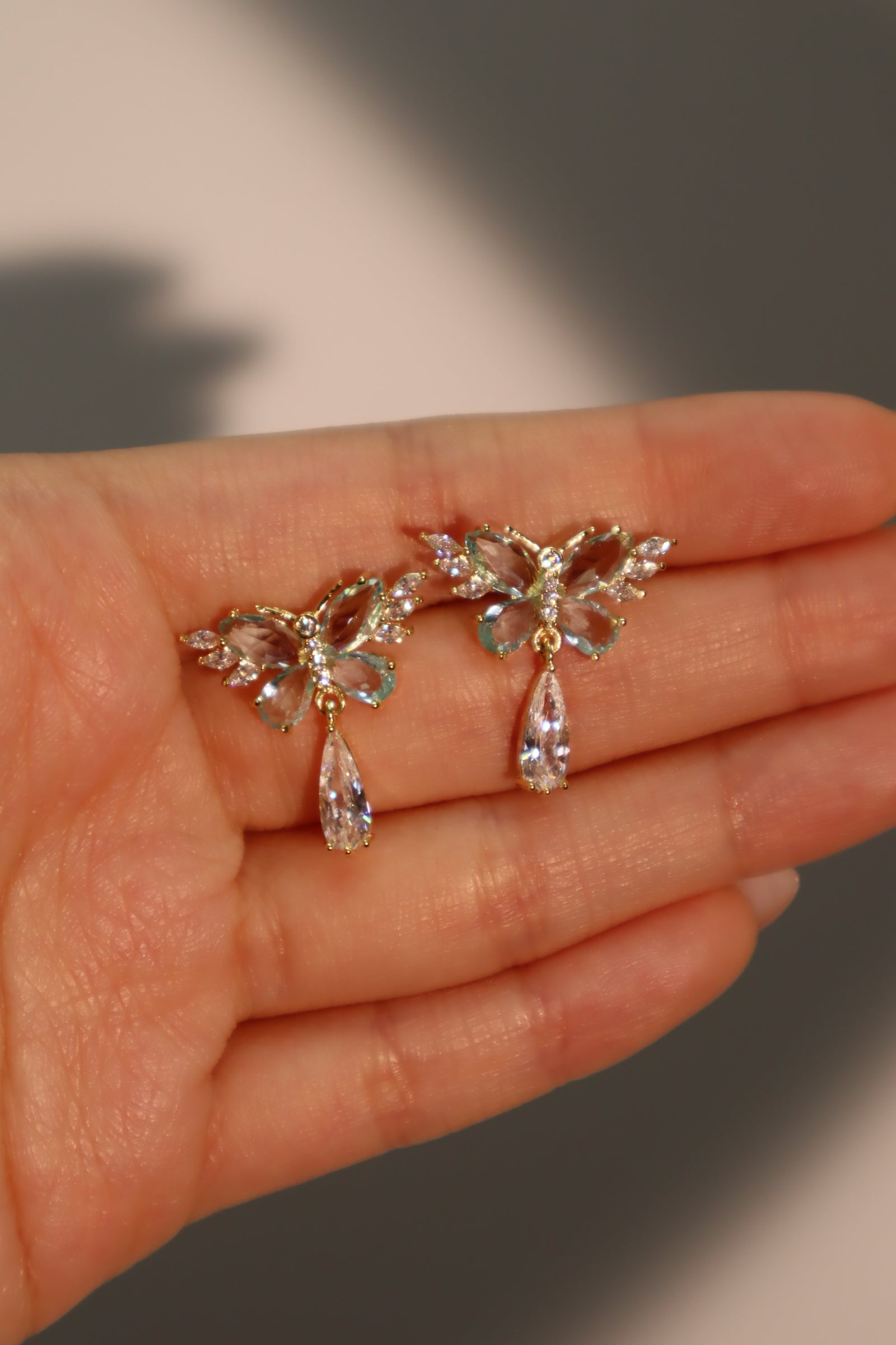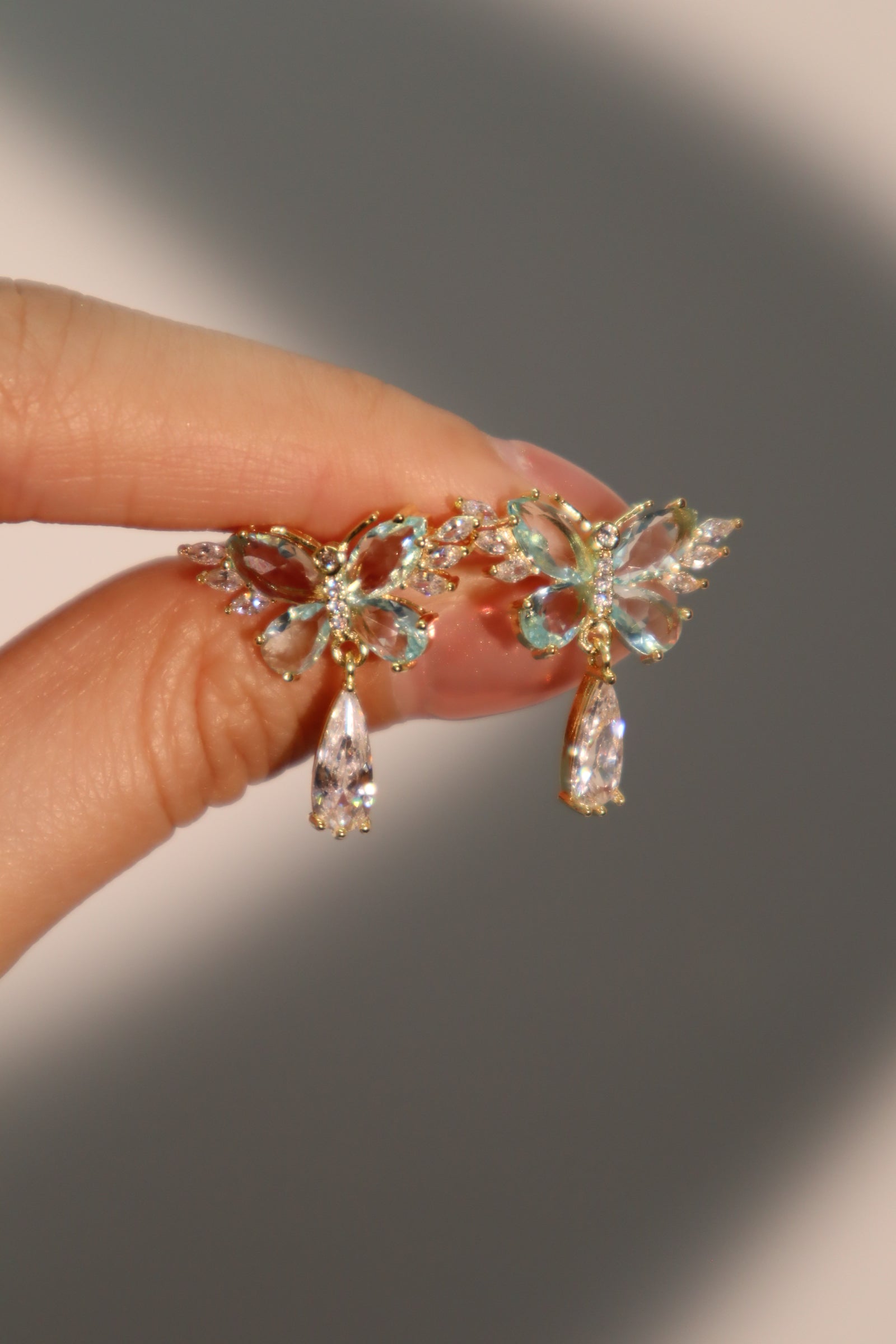 Our 14K Real Gold Plated Blue Gem Butterfly Diamond Earrings are ethereal. This pair of earrings is adorned with high quality zirconia green gemstones that sparkle and shine angelically. When you can’t decide on a look, match these earrings with your outfit to be your saving grace!