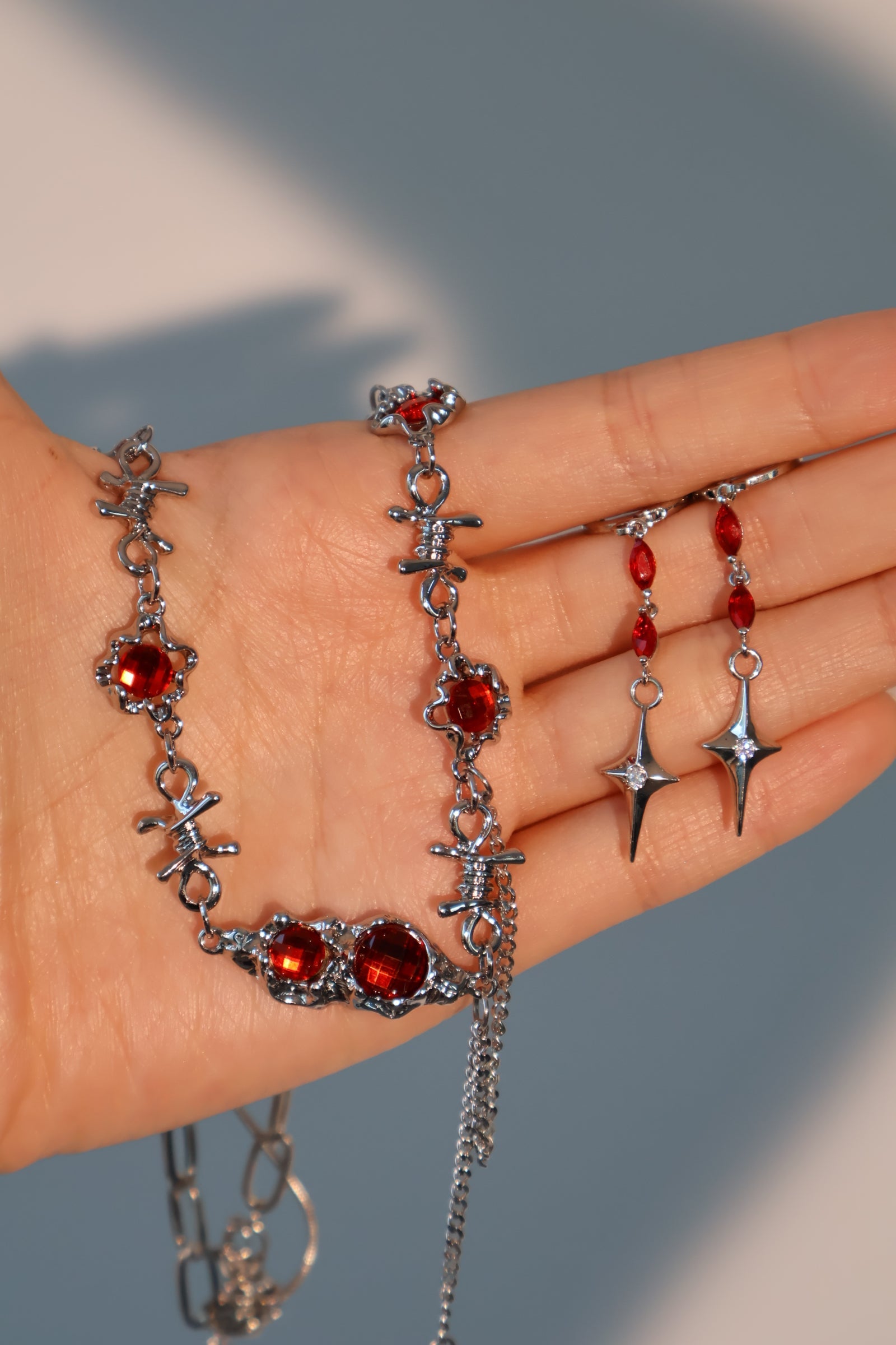 - High quality silver plated + well-cut zirconia diamonds + zirconia red gemstones