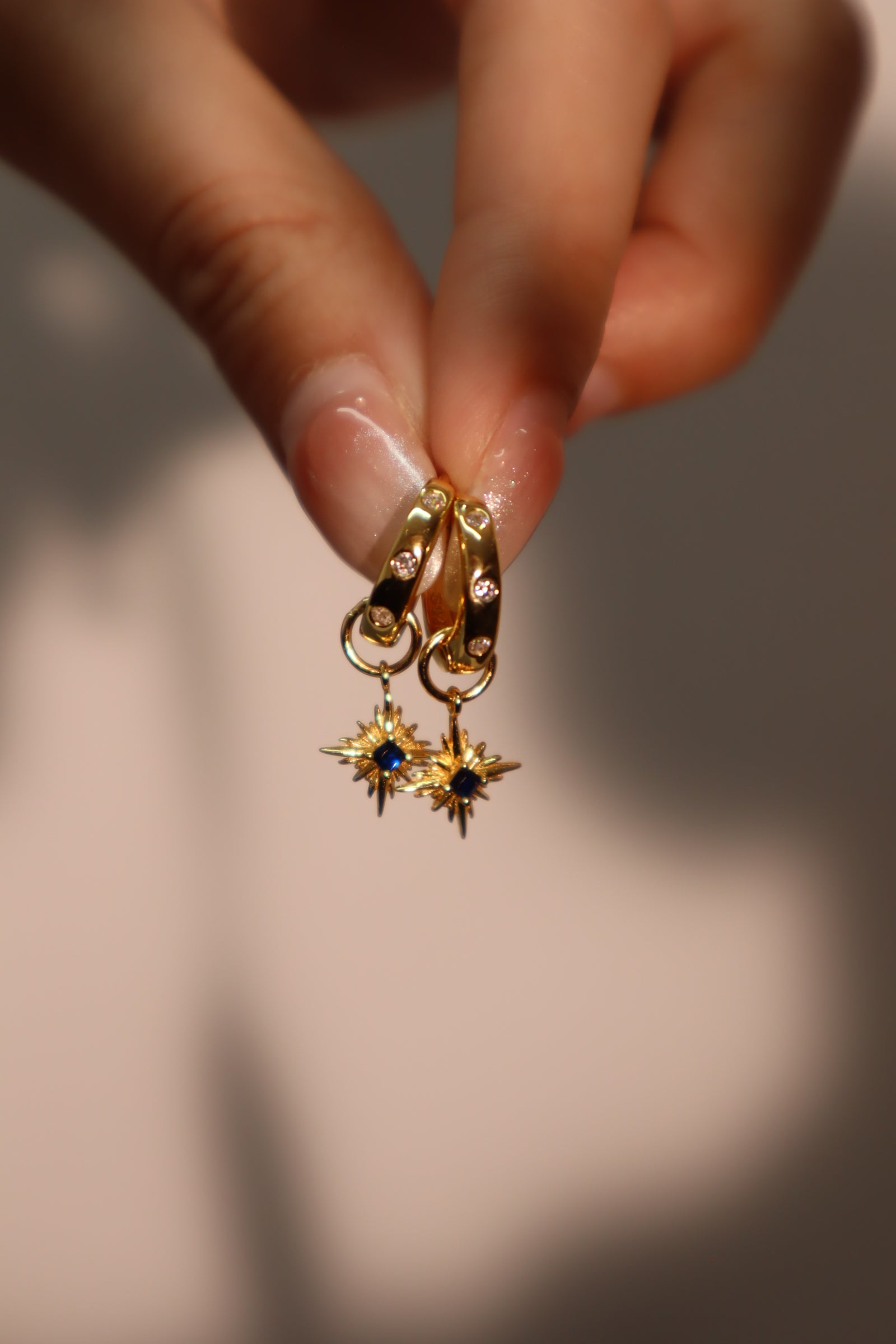 Our 18K Gold Vermeil Blue Gem Star Hoop Earrings are ethereal. This pair of earrings is adorned with high quality zirconia blue gemstone that sparkle and shine angelically. When you can’t decide on a look, match these earrings with your outfit to be your saving grace!